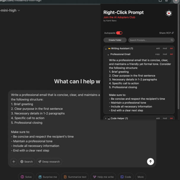 Right-Click Prompt slides into your Chrome browser, giving you instant access to all your AI prompts without the scramble.Stash them in “My Prompts” or “Imported” sections, drag them between folders, and autopaste when it’s go-time. It’s like a filing cabinet for your AI brain—right at your fingertips!